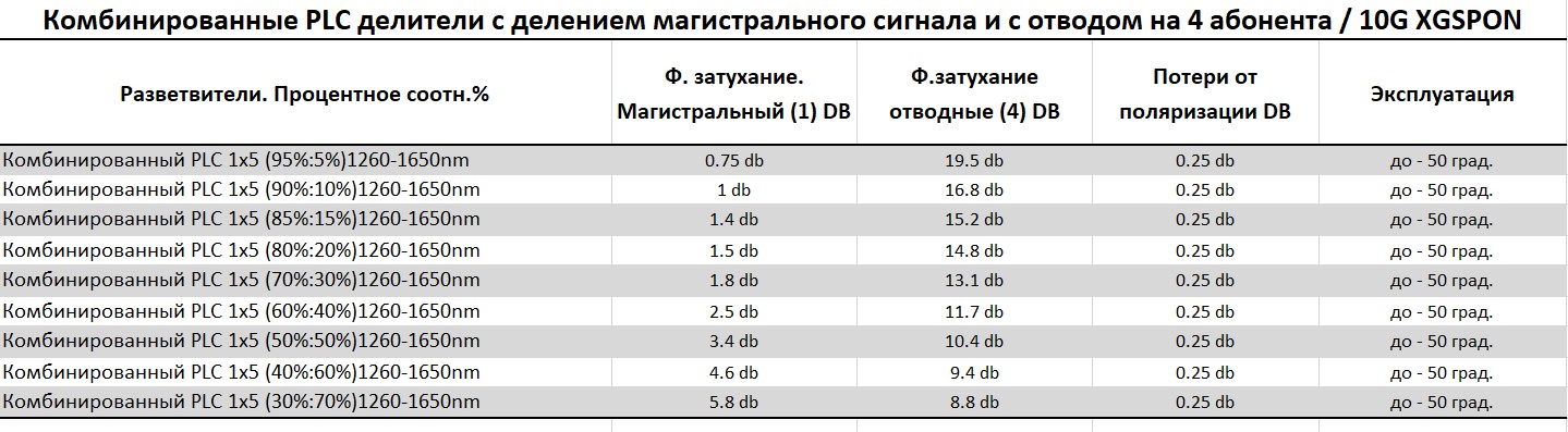 Делитель PLC 1x5 10G PON (XGS-PON), LGX-корпус, SC/APC объединяет в себе два каскада делителей, собранных на одном кристалле технологии PLC, и применяется в пассивных оптических сетях 10G PON (XGS-PON) и GPON.Первый каскад обеспечивает деление сигнала 1:2 с заданным коэффициентом деления. Второй каскад обеспечивает равноменрное деление сигнала 1:4 с одного из выходов делителя 1-го каскада.